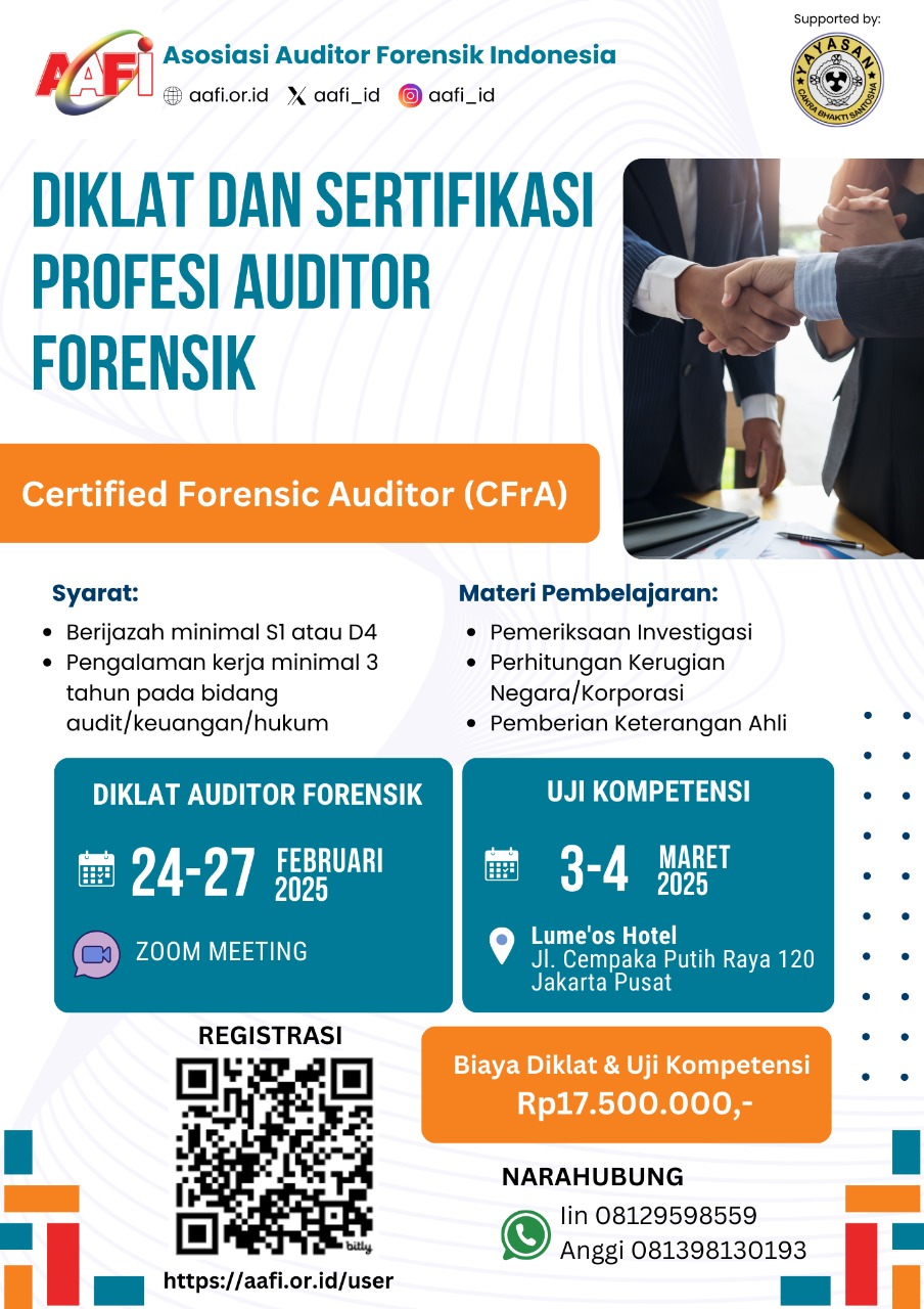 Asosiasi Auditor Forensik Indonesia Yudimba (AAFI YUDIMBA), dengan dukungan dari Yayasan Cakra Bhakti Santosha, kembali mengadakan Diklat dan Sertifikasi Profesi Auditor Forensik dengan gelar Certified Forensic Auditor (CFrA). Program ini bertujuan untuk meningkatkan kompetensi para auditor dalam bidang audit investigatif dan forensik guna mendukung upaya pemberantasan tindak pidana keuangan dan korupsi.