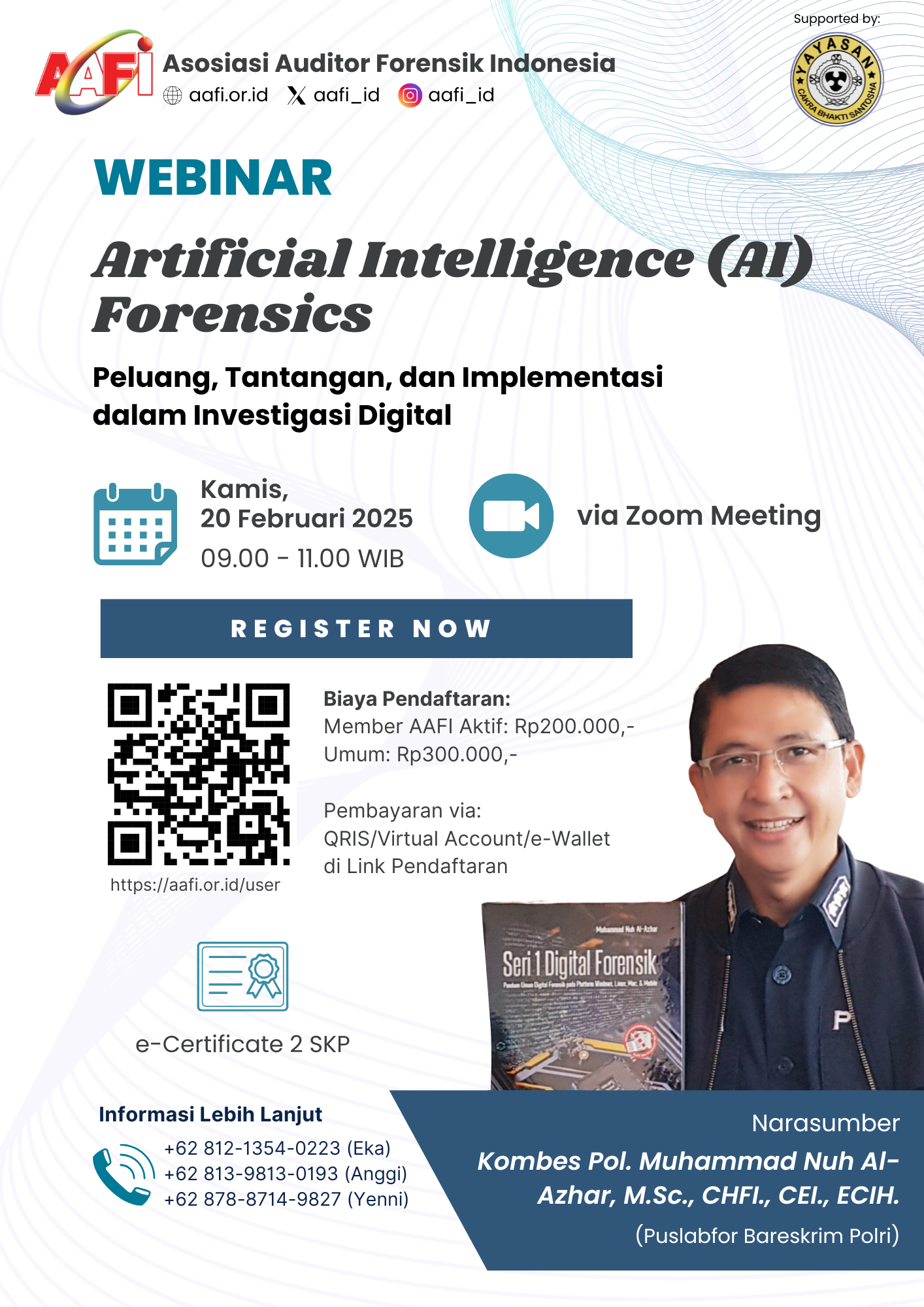 Untuk menjawab pertanyaan-pertanyaan ini, Asosiasi Auditor Forensik Indonesia Yudimba (AAFI YUDIMBA), dengan dukungan dari Yayasan Cakra Bhakti Santosha, mengadakan webinar bertema "Artificial Intelligence (AI) Forensics".