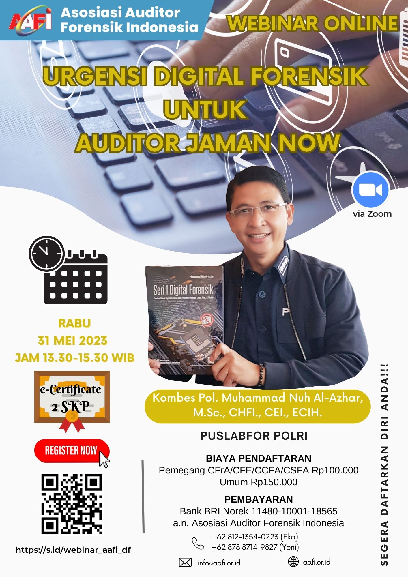 Asosiasi Forensik Auditor Indonesia (AAFI YUDIMBA) mengundang Bapak/Ibu dalam Webinar Online dengan Tema "URGENSI DIGITAL FORENSIK UNTUK AUDITOR JAMAN NOW" yang menghadirkan Ahli Digital Forensik, Komisaris Besar Polisi Muhammad Nuh Al-Azhar, S.T., M.Sc., CHFI., CEI., ECIH. dari PUSLABFOR POLRI.